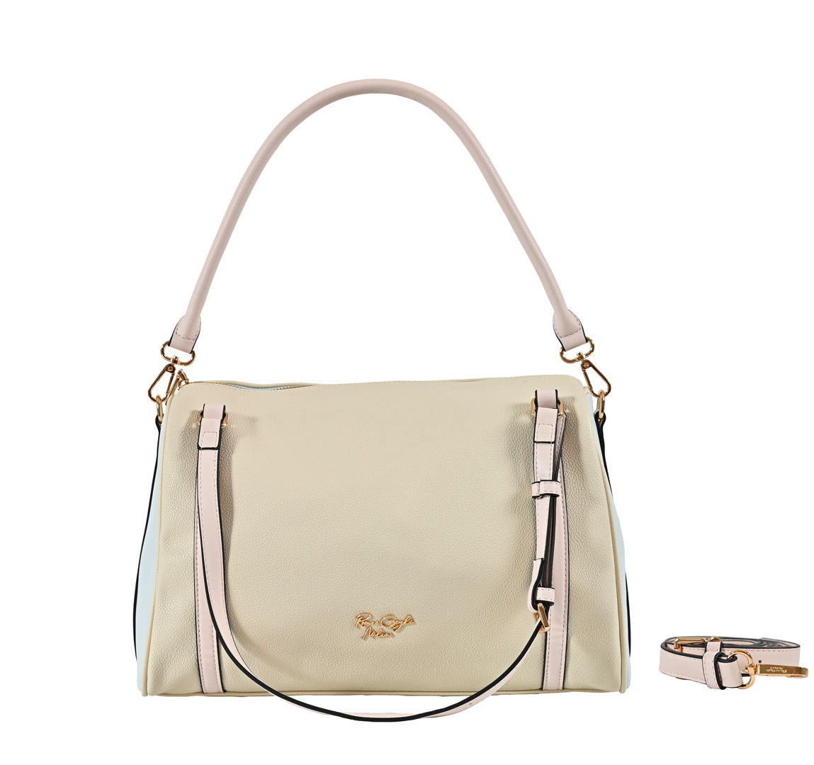 BORSA A SPALLA CON ACCESSORIO DORATO FRONTALE E DOPPIA TRACOLLA. FODERA INTERNA IN COTONE CON TASCA