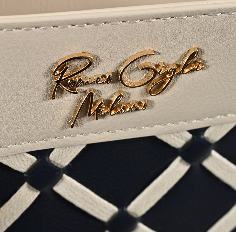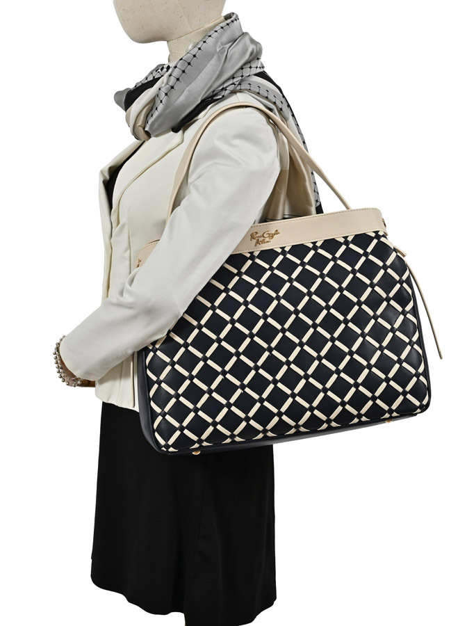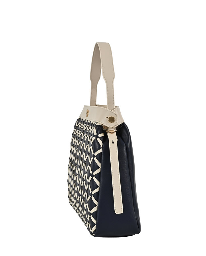 BORSA A SPALLA CON TRAMA INTRECCIATA ED ACCESSORIO DORATO FRONTALE. FODERA INTERNA IN COTONE CON TASCA