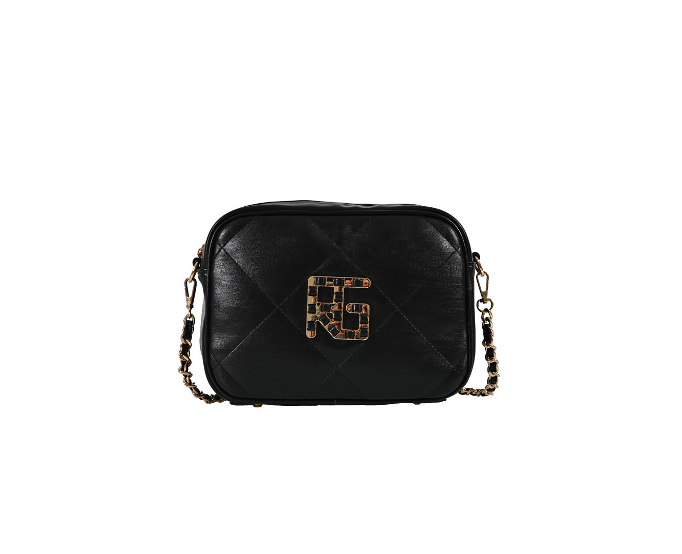 BORSA A SPALLA CON ACCESSORIO DORATO FRONTALE E CATENA INTRECCIATA. FODERA INTERNA IN COTONE CON TASCA