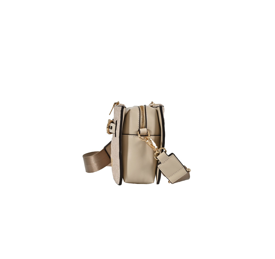 BORSETTA A SPALLA CON ACCESSORIO DORATO FRONTALE E TESSUTO PERSONALIZZATO CON NASTRO E TRACOLLA. FODERA INTERNA IN COTONE CON TASCA